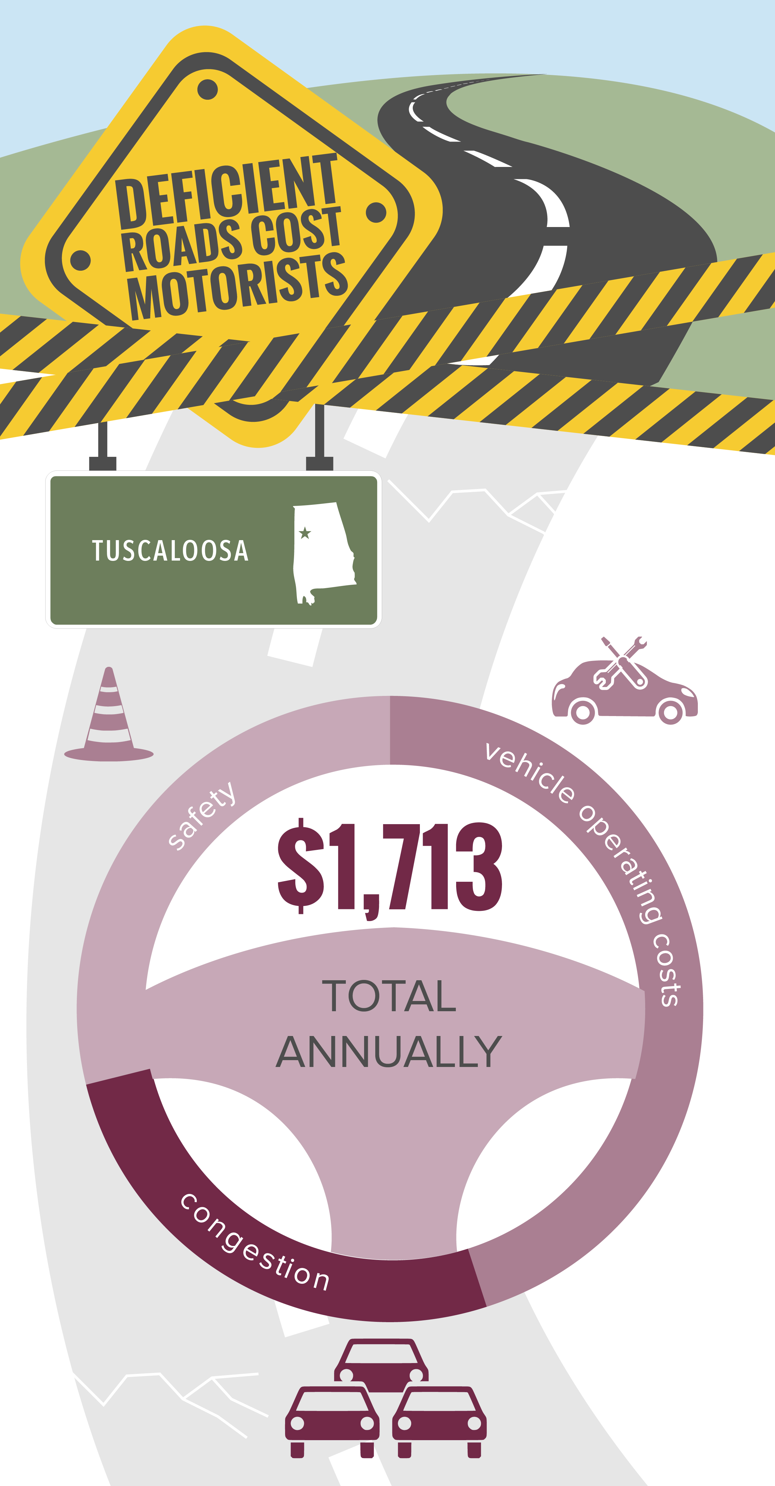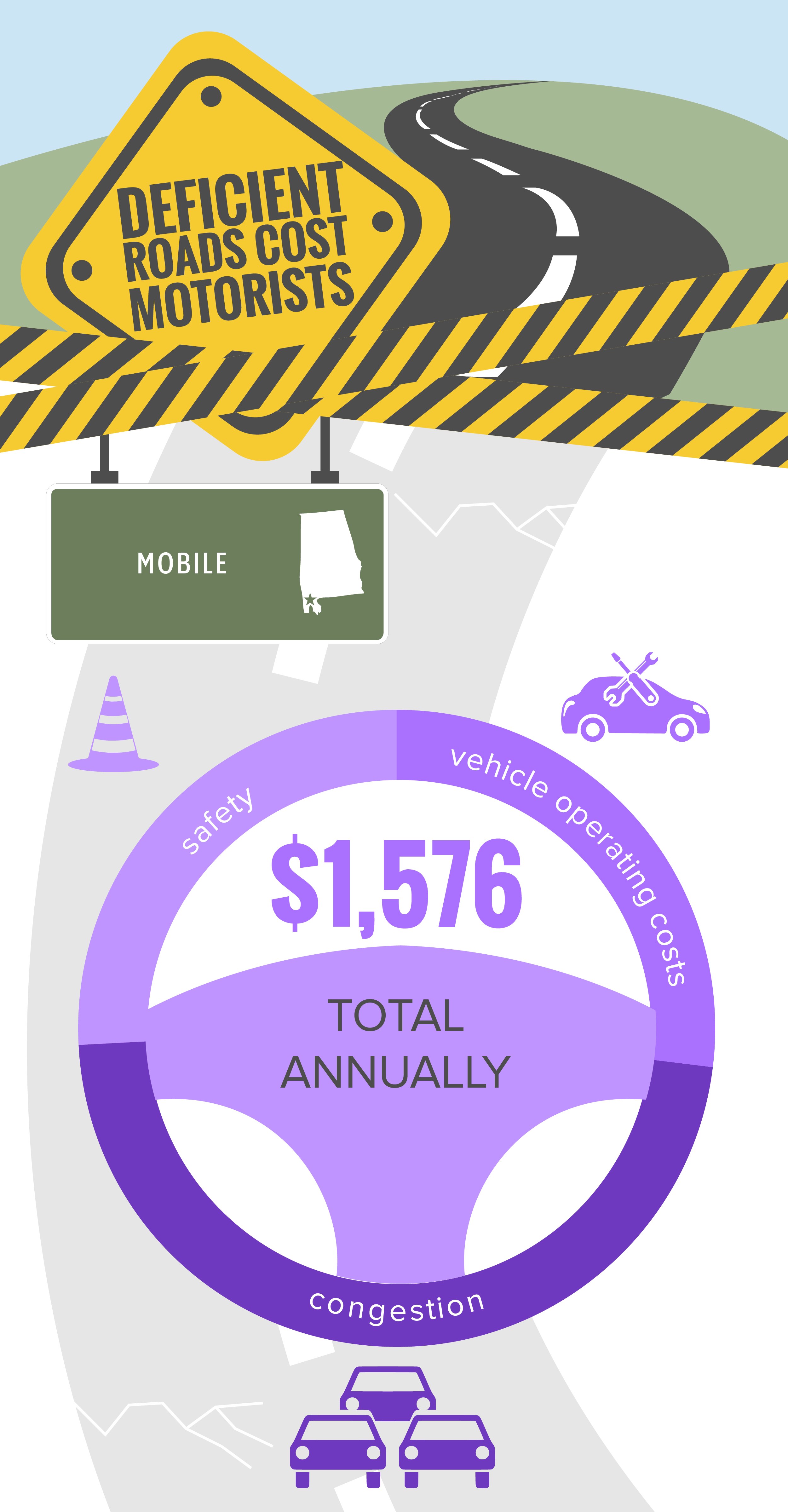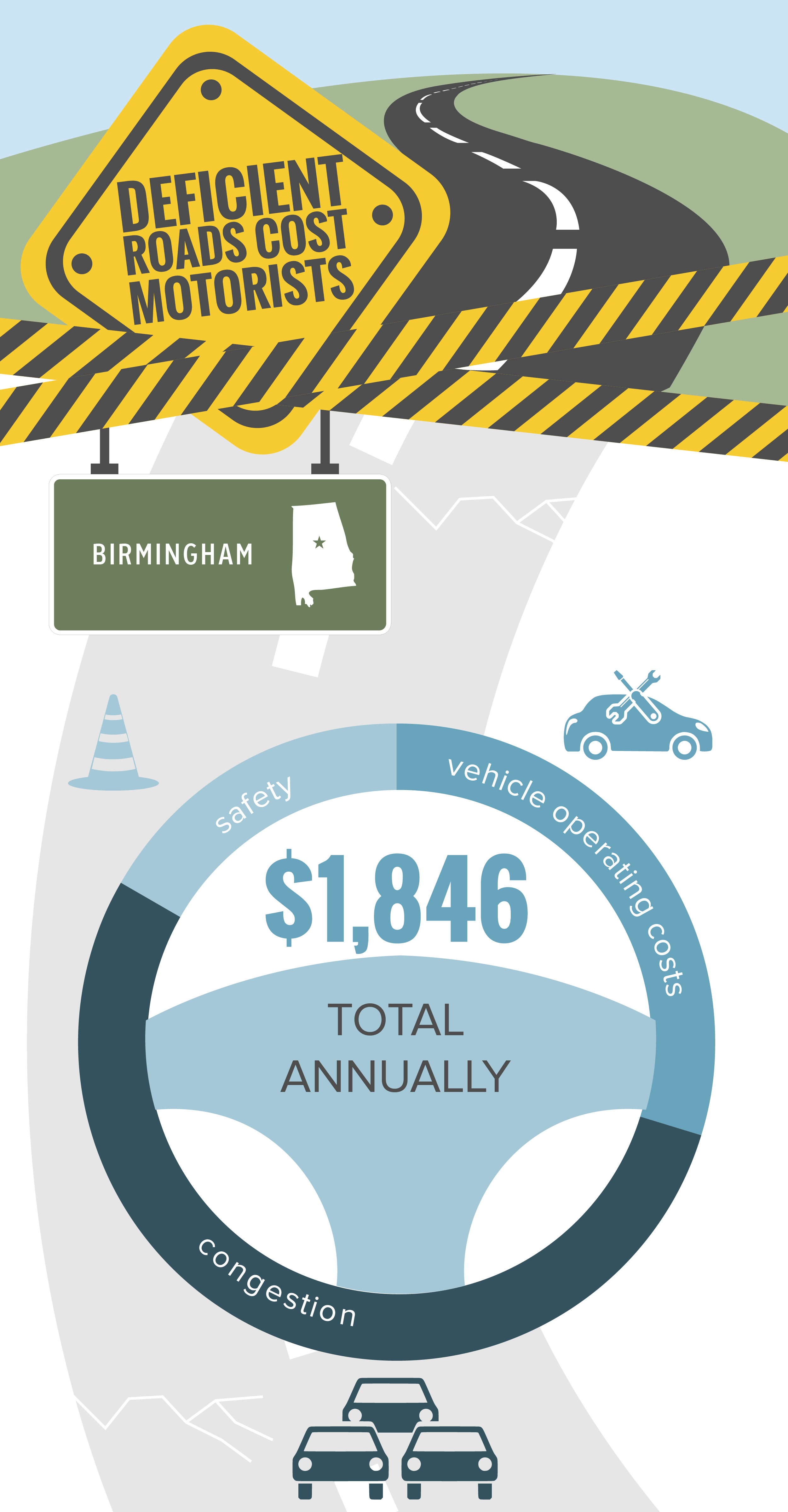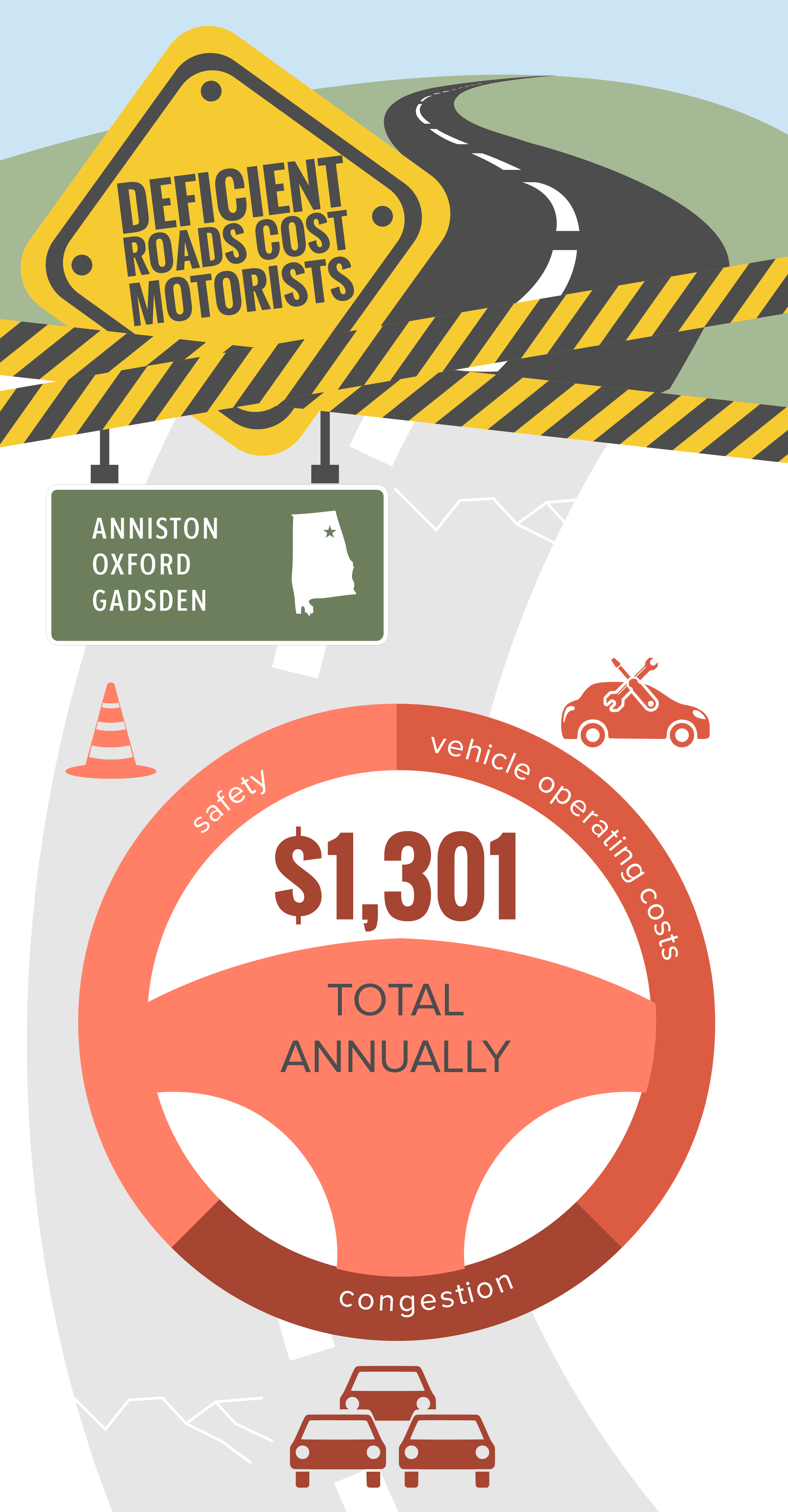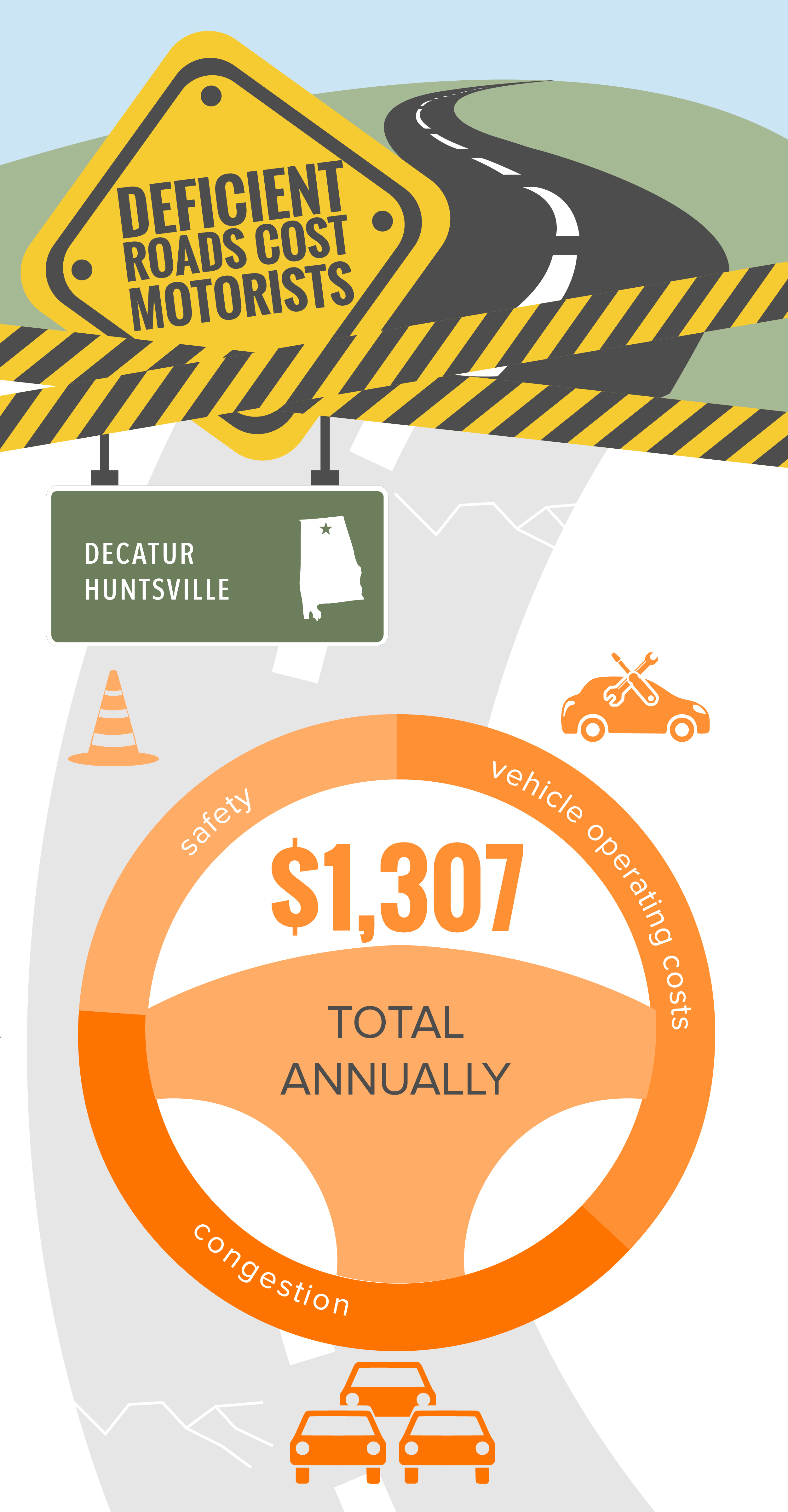 Driving on Alabama roads that are deteriorated, congested and that lack some desirable safety features costs Alabama drivers a total of $5.3 billion each year. TRIP has calculated the cost to the average motorist in the state’s largest urban areas in the form of additional vehicle operating costs (VOC) as a result of driving on rough roads, the cost of lost time and wasted fuel due to congestion, and the financial cost of traffic crashes. The chart below details the cost of deficient roads statewide and for the average driver in the state’s largest urban areas.