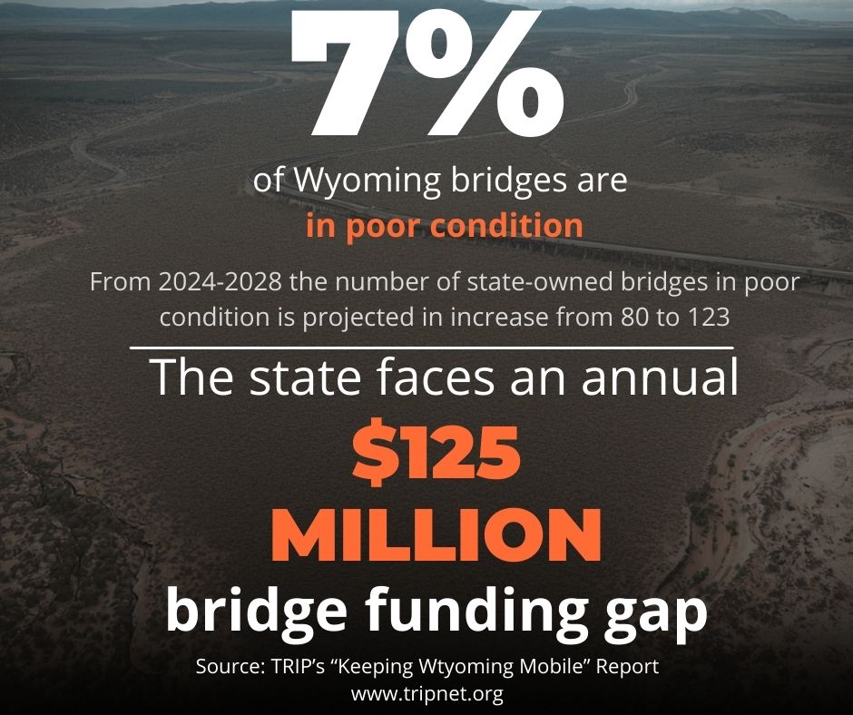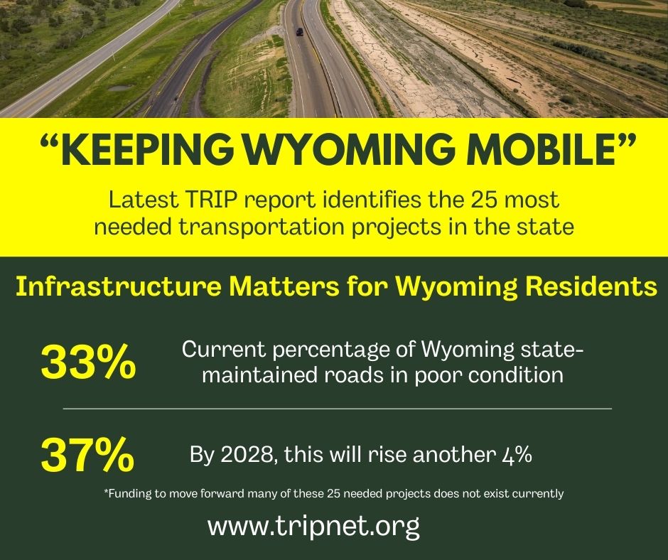 TRIP’s “Keeping Wyoming Mobile” report examines the condition, use, safety and efficiency of Wyoming’s surface transportation system and documents needed transportation improvements throughout the state. The report examines the state’s transportation funding challenges, which include a significant funding shortfall, decreasing transportation funding revenue due to increasing fuel efficiency and the adoption of electric vehicles, and decreased purchasing power of existing funds due to inflation.
