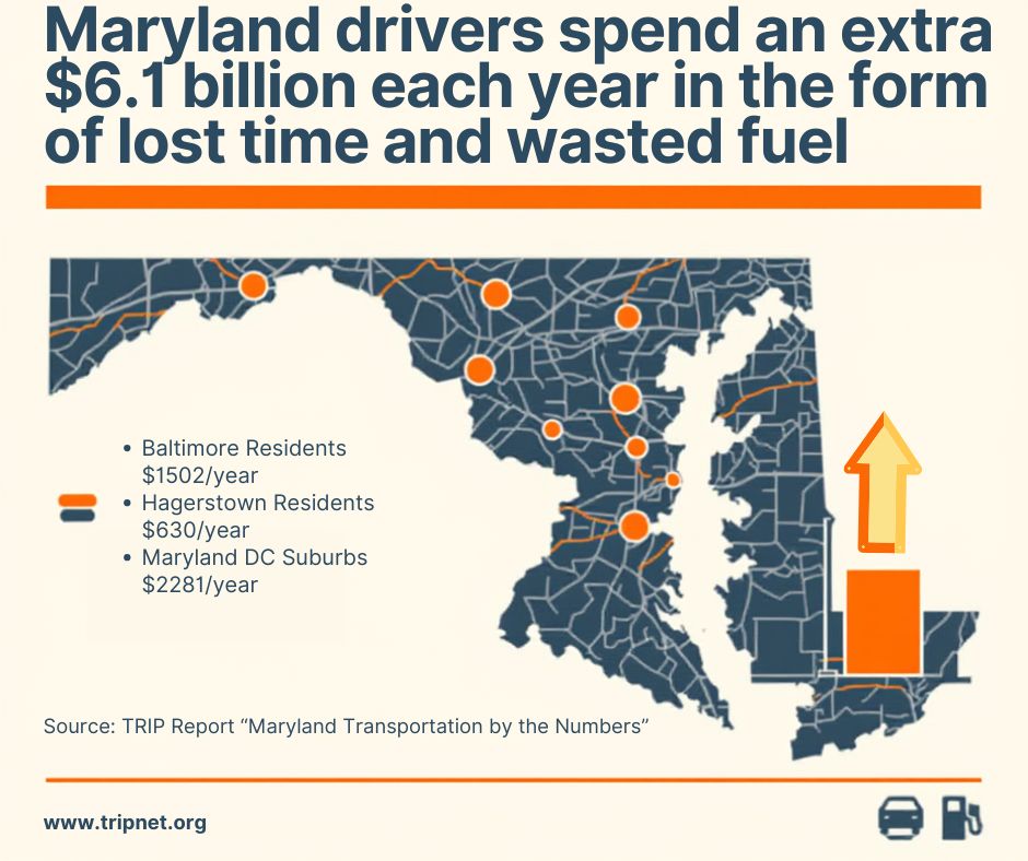 This report examines the condition, use and safety of Maryland’s roads, highways and bridges, and the state’s future mobility needs. Sources of information for this report AAA, the AAA Foundation for Traffic Safety, the American Association of State Highway and Transportation Officials (AASHTO), the American Road & Transportation Builders Association (ARTBA), the Bureau of Transportation Statistics (BTS), the Federal Highway Administration (FHWA), the Maryland Department of Transportation (MDOT), the National Highway Traffic Safety Administration (NHTSA), the Texas Transportation Institute (TTI), The Transportation Research Board (TRB), the U.S. Census Bureau, and the U.S. Department of Transportation. In addition to statewide data, the TRIP report includes regional data for the following areas: Baltimore, Frederick/Hagerstown and Maryland DC suburbs. An urban area is defined as a region’s municipalities and surrounding suburbs for pavement condition and congestion data; bridge and traffic fatality data include a region’s major counties.
