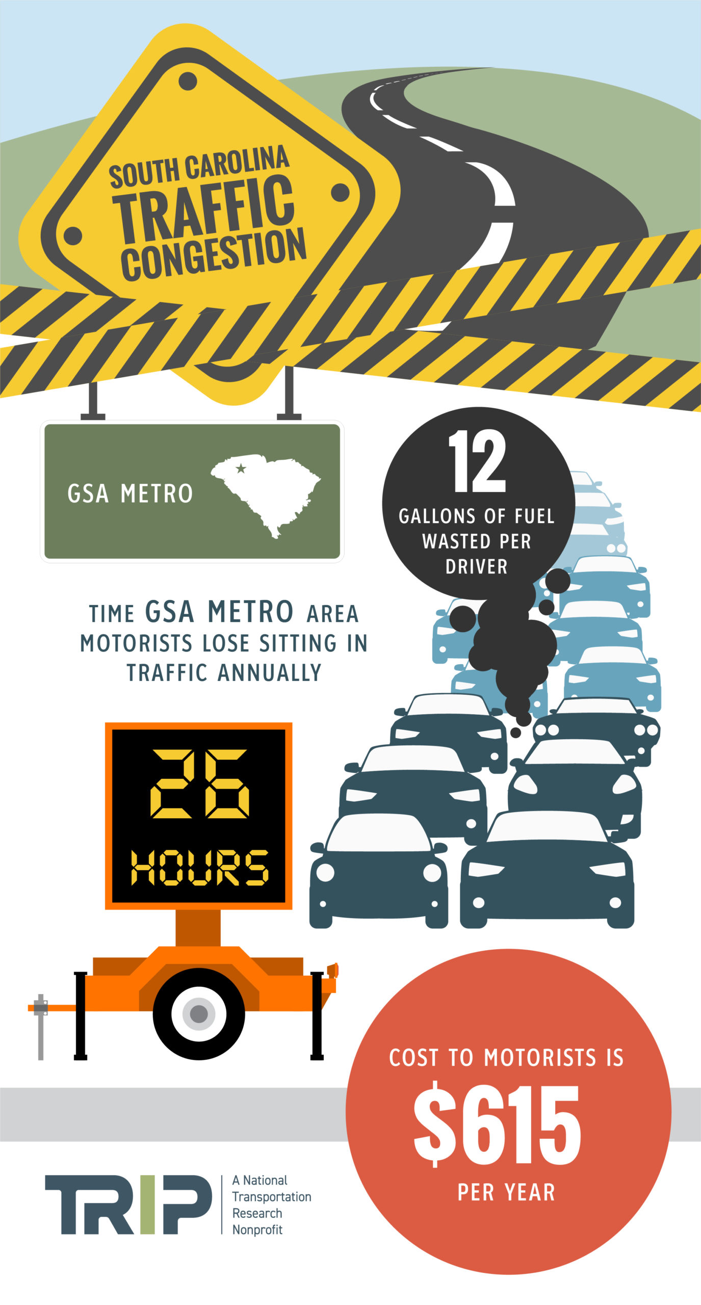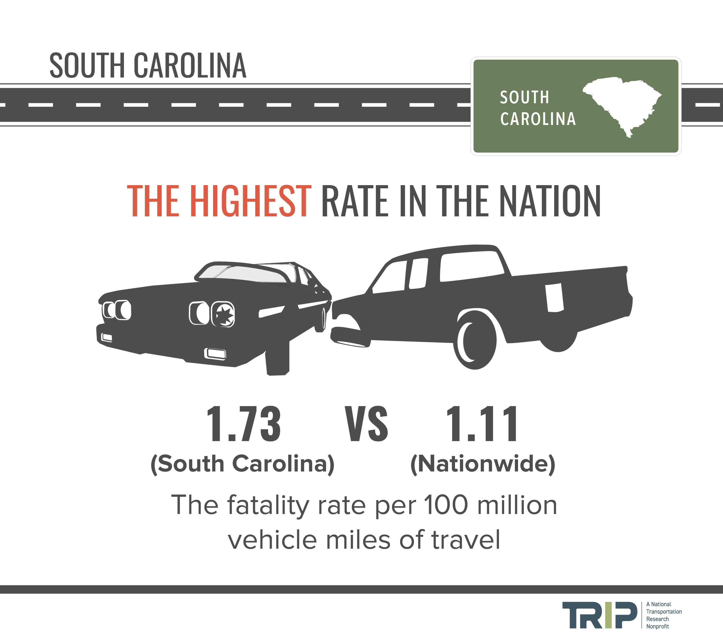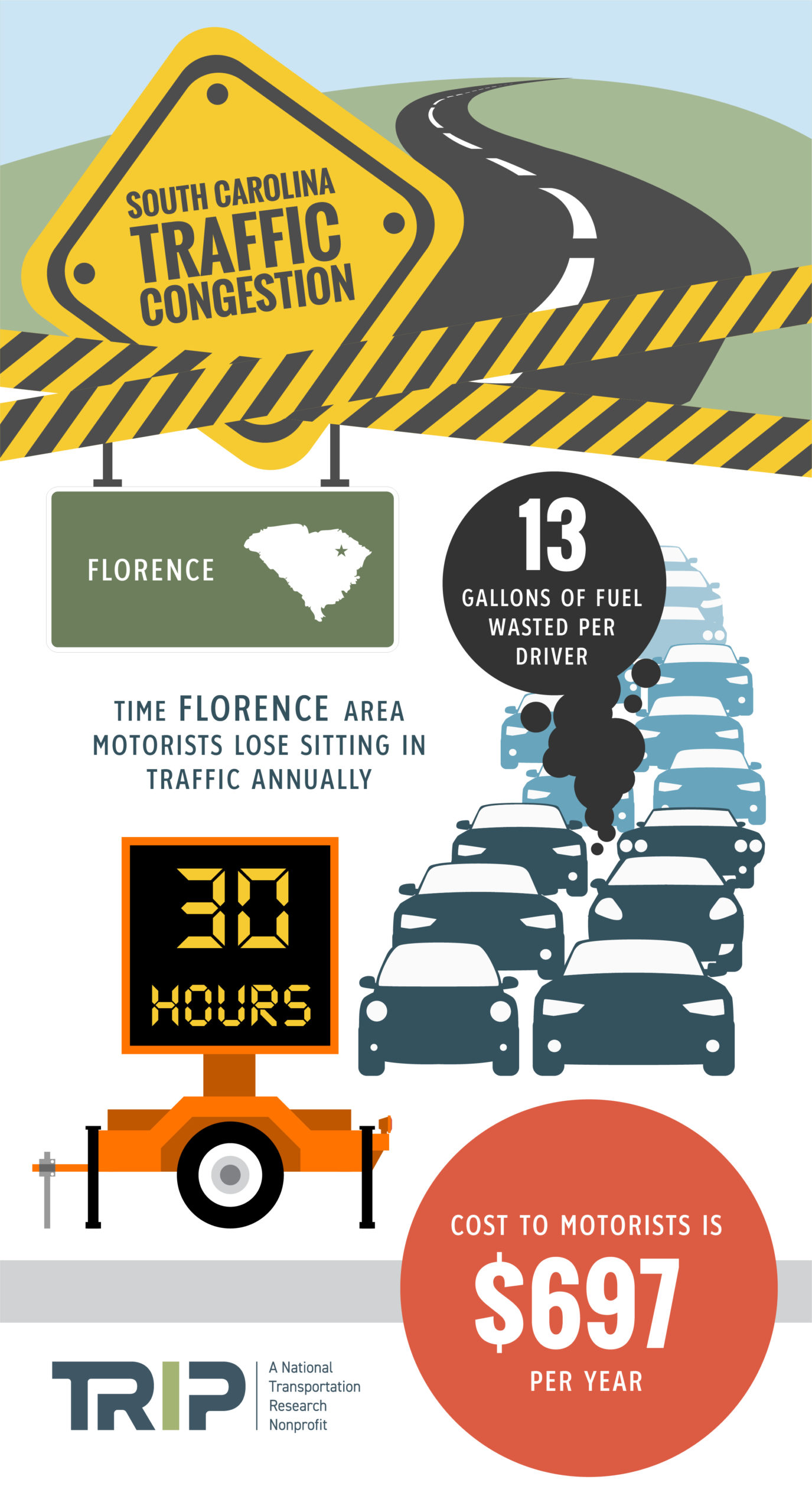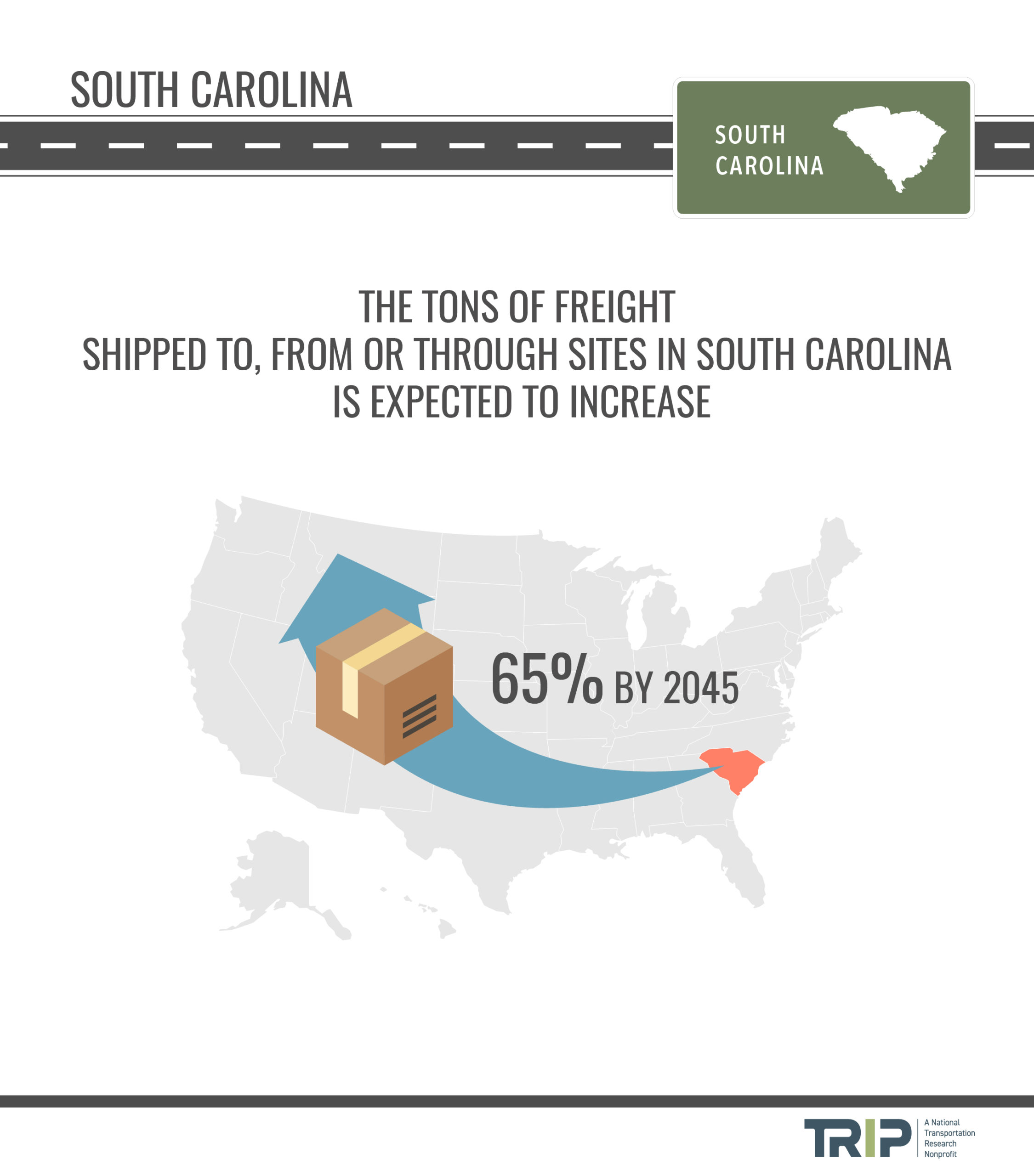 TRIP’s “Moving South Carolina Forward” report examines the condition, use, safety and efficiency of South Carolina’s surface transportation system, the impact of Act 40, the importance of reauthorization of the federal surface transportation program and the challenges South Carolina faces to accommodate future transportation growth and sustain adequate state funding despite the potential of increasing fuel efficiency standards and the adoption of electric vehicles. Sources of information for this report include the South Carolina Department of Transportation (SCDOT), the Federal Highway Administration (FHWA), the American Association of State Highway and Transportation Officials (AASHTO), the Bureau of Transportation Statistics (BTS), the U.S. Census Bureau, the Texas Transportation Institute (TTI), the American Road & Transportation Builders Association (ARTBA), and the National Highway Traffic Safety Administration (NHTSA).