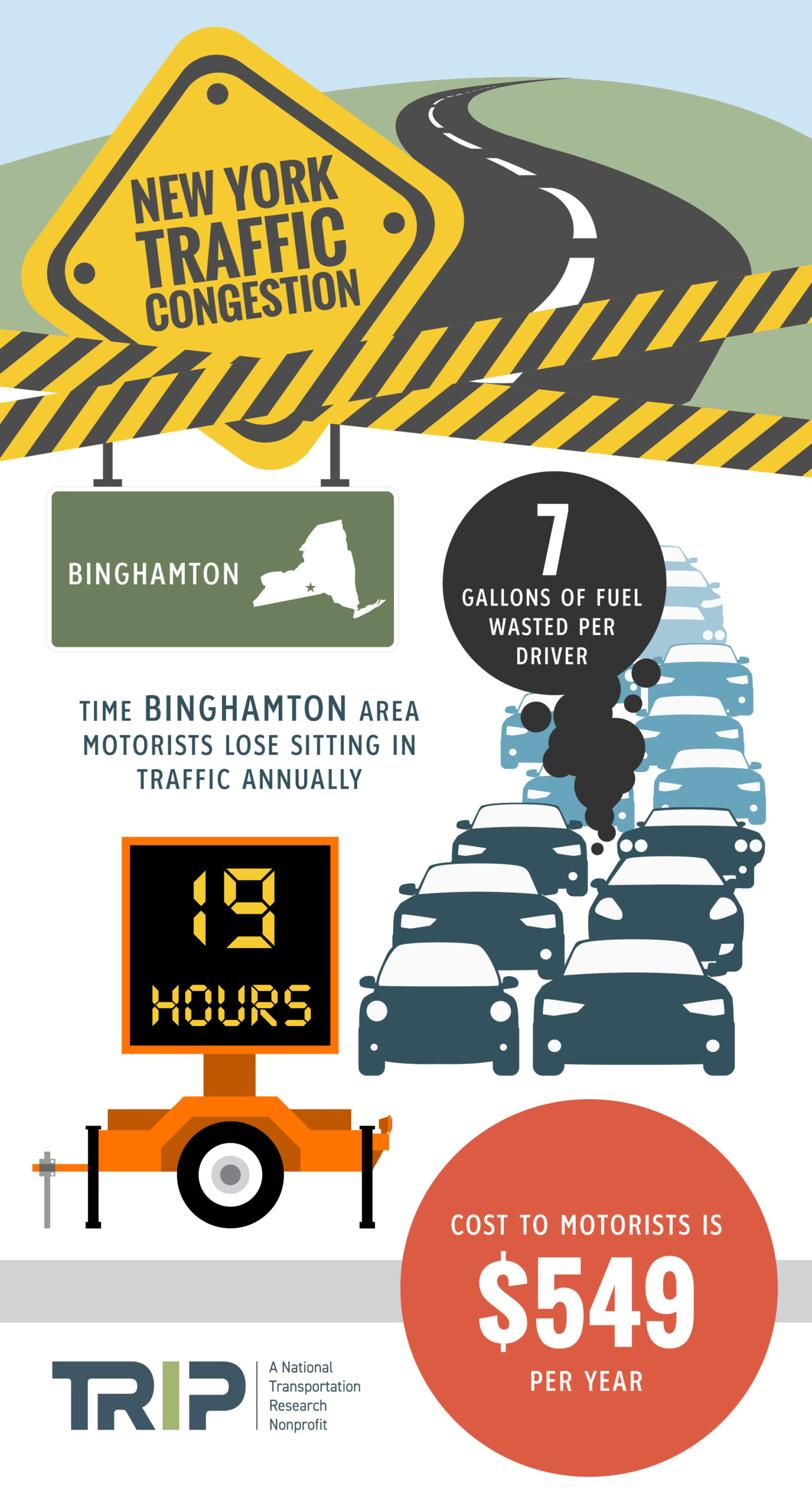 In addition to statewide data, the TRIP report includes regional data for the Albany-Schenectady-Troy, Binghamton, Buffalo-Niagara Falls, New York-Newark-Jersey City, Poughkeepsie-Newburgh-Middletown, Rochester, Syracuse and Utica urban areas. An urban area is defined as a region’s municipalities and surrounding suburbs for pavement condition and congestion data; bridge and traffic fatality data include a region’s major counties.