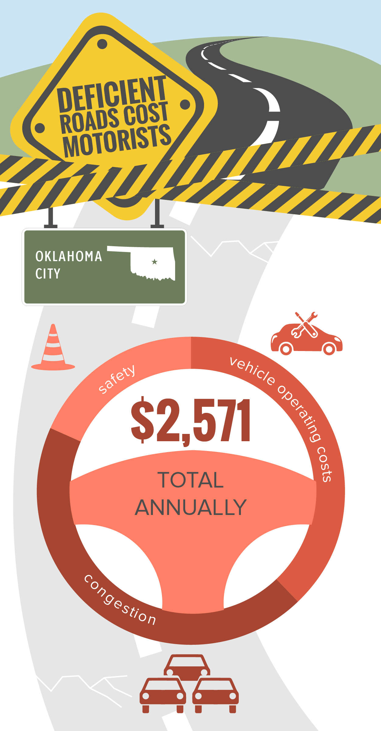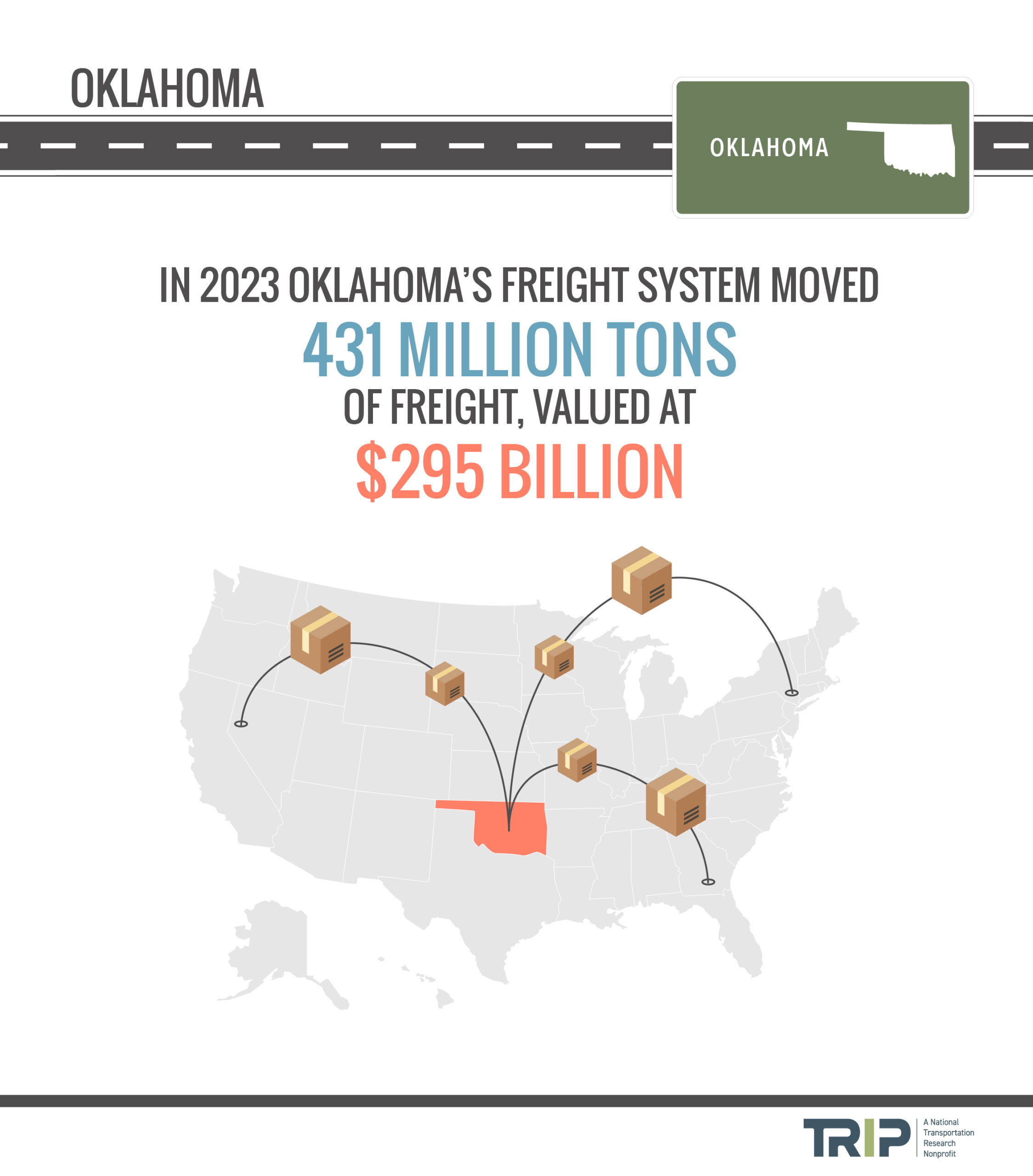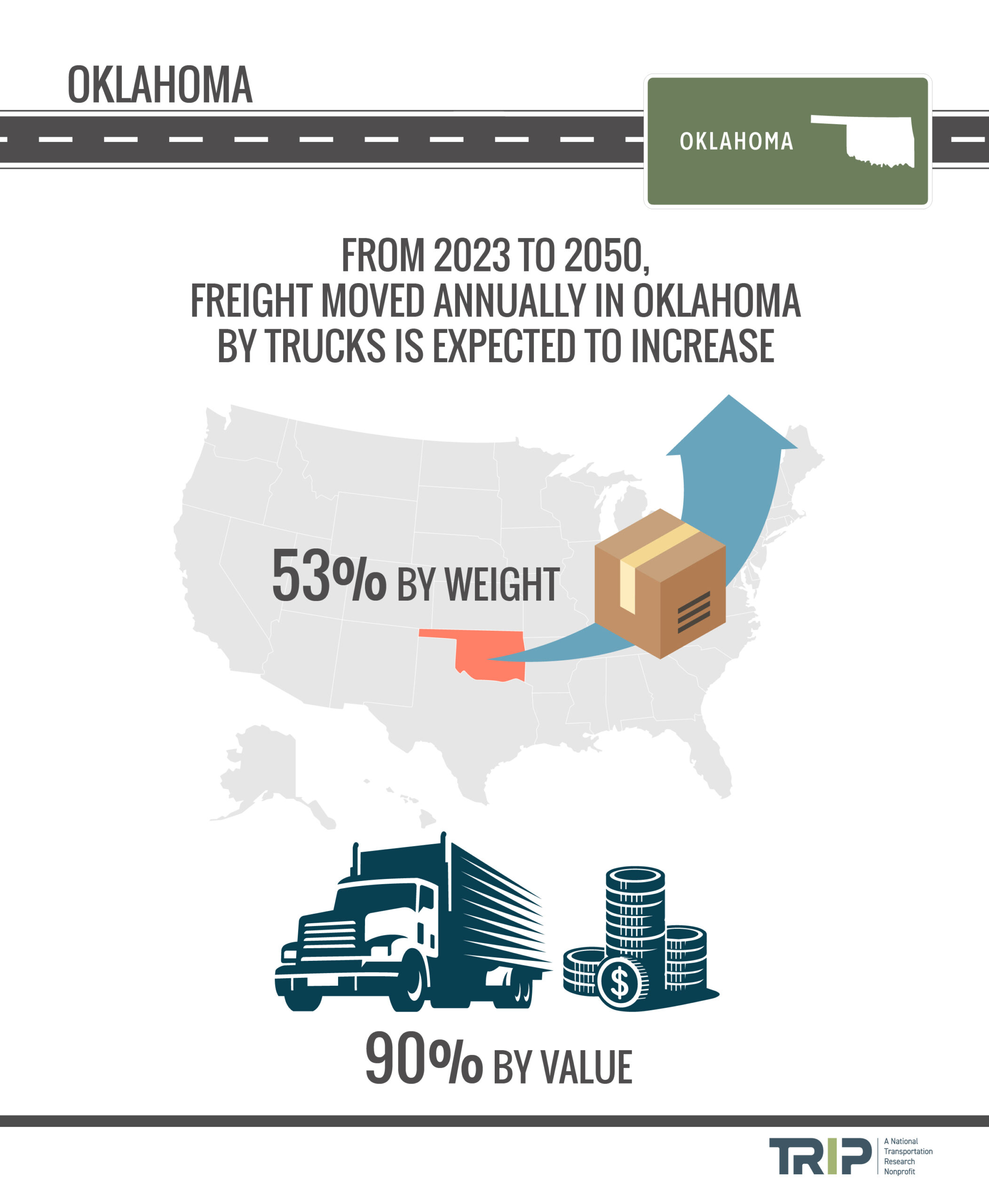 TRIP’s “Oklahoma Transportation by The Numbers” report examines the condition, use, safety, efficiency and funding needs of Oklahoma’s surface transportation system. The report also looks at the challenges Oklahoma faces to accommodate future transportation growth, maintain the existing system, and sustain adequate state transportation investment despite the funding impacts of highway construction cost inflation, increasing fuel efficiency standards, and the adoption of electric vehicles.