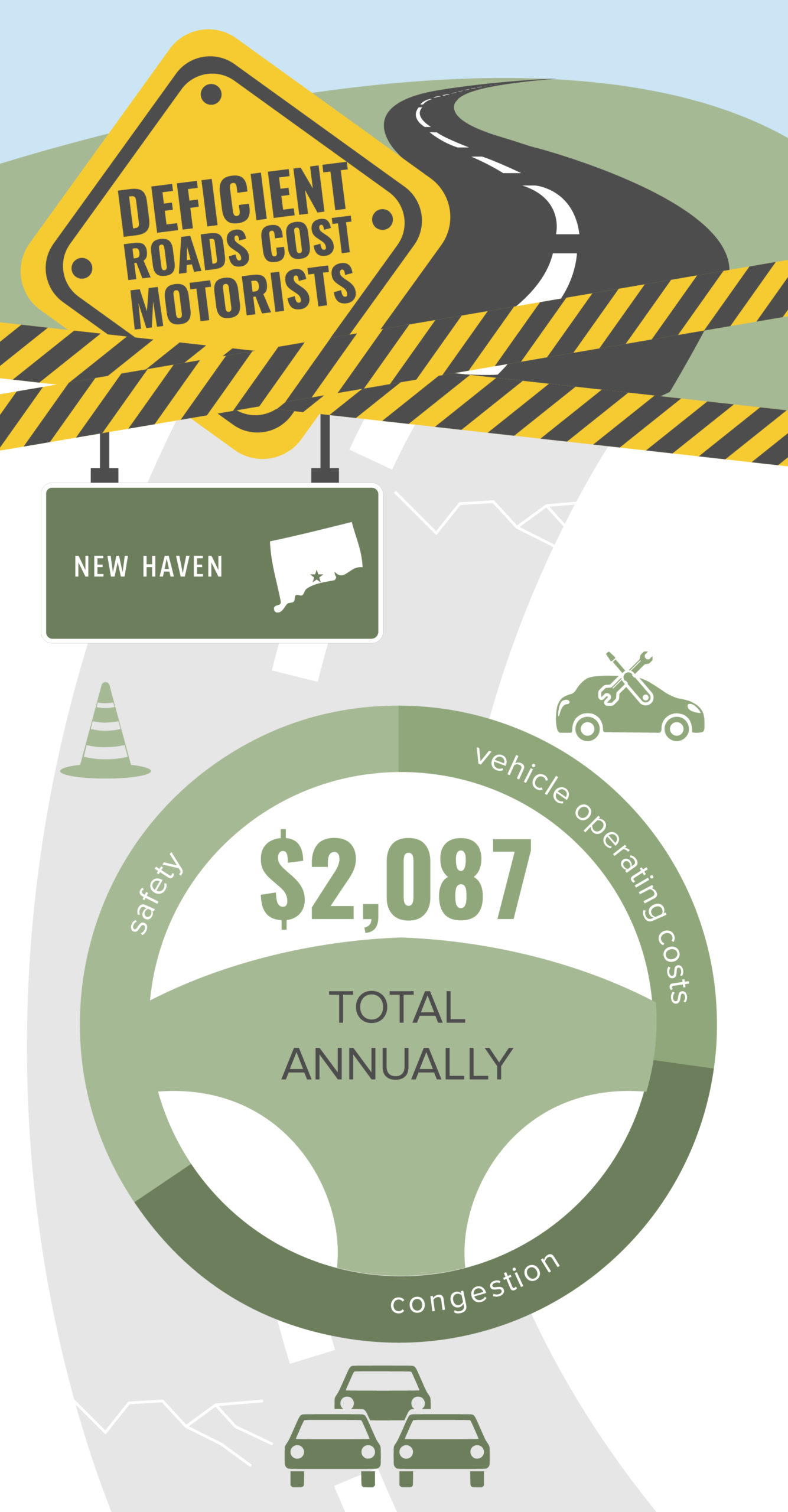 In addition to statewide data, the TRIP report includes regional data for the Bridgeport-Stamford, Hartford and New Haven regions. An urban area is defined as a region’s municipalities and surrounding suburbs for pavement condition and congestion data; bridge and traffic fatality data include a region’s major counties.